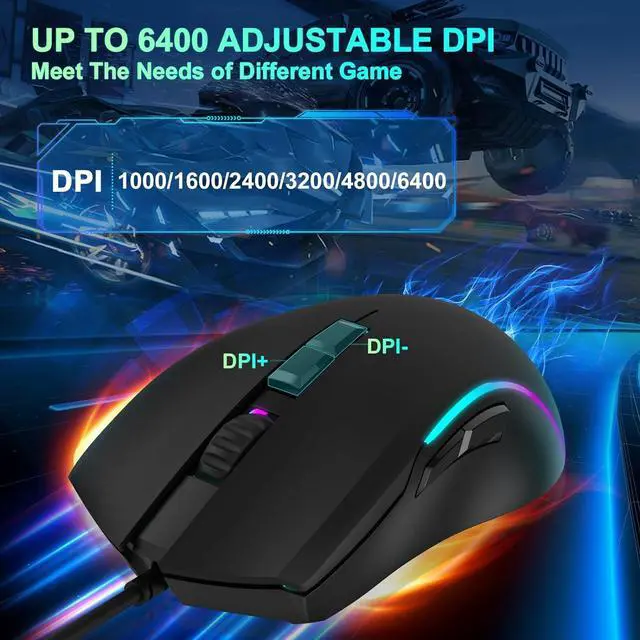 High Sensitivity Gaming Mouse 6 adjustable DPI (1000, 1600, 2400, 3200, 4800, 6400). High speed transmission technology makes it move faster and more accurate. 6 preset levels of DPI meet the needs of different scenarios. 7 different mouse lighting modes create a stimulating and tense gaming atmosphere. 7-button design to meet your different gaming needs.