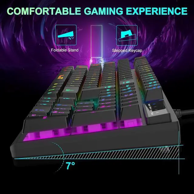 Cool Rainbow Backlit Gaming Keyboard104 Keys Full Size Keyboard. Featuring standard keyboard layout with F-keys (function keys) and number pad. Adjustable stands offer your hands to gaming in a more comfortable position, which help reduce hand fatigue. Adjustable RGB backlit keyboard allows you to enter the game faster and enjoy the fun of the game.