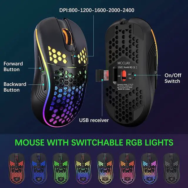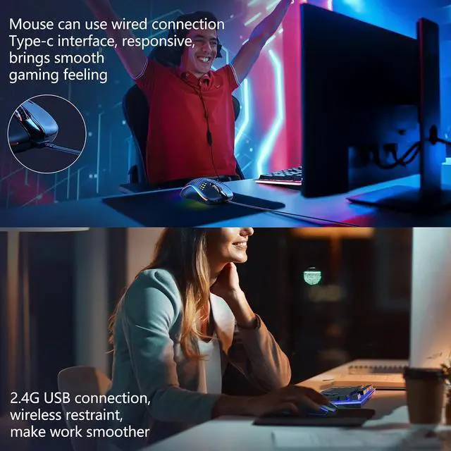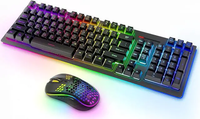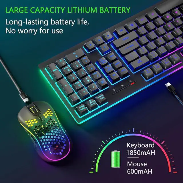 Ergonomic Wireless Keyboard with Mice: When you raise the bottom supports of the gaming keyboard, it forms a 7° angle with the desktop, which, combined with the stepped keycap structure, better aligns with the natural movement of your fingers. This provides a comfortable typing experience and reduces fatigue. The lightweight honeycomb exterior design of the backlit mouse helps improve airflow during gaming, allowing for easy and precise control, enhancing your gaming experience.
