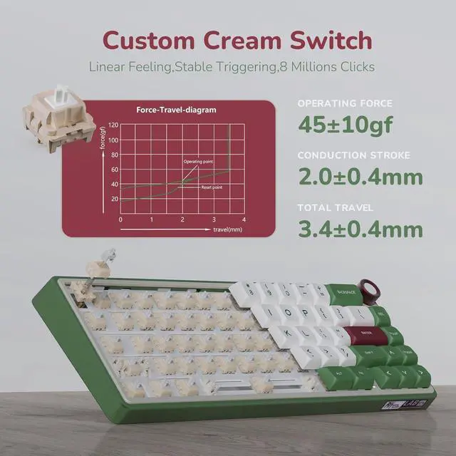 Hot Swappable Cream Switches: Hot swappable mechanical keyboard comes with pre-lubed cream switch. These linear switches have a unique look, quiet sound and excellent keystroke feel. High quality PCB board compatible with 3pin/5pin switches. You can have a high degree of customization