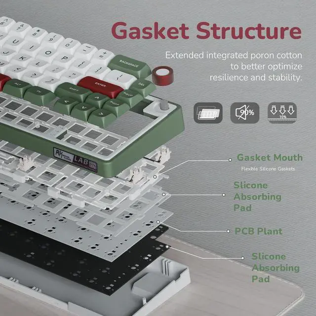Percent Gasket Mount Mechanical Keyboard: Compact gaming keyboard adopts a gasket structure with five layers of sound-absorbing material. There is poron cotton for buffering between the keyboard PCB board and the casing, which can effectively reduce the noise and vibrate of the keys, optimize the sound of the switches, and provide better typing experience