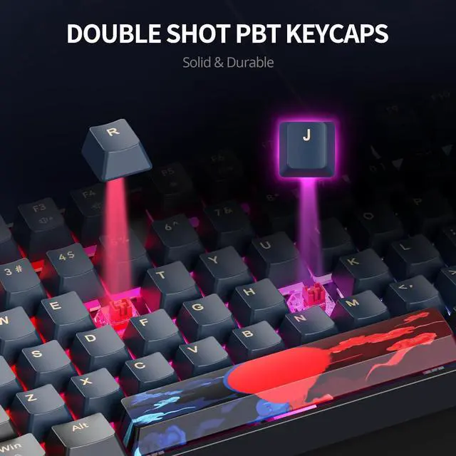 PBT+Dye-sub Keycaps: The mechanical keyboard come with the PBT keycaps and some extra dye-sub keycaps. The keycaps have a textured surface that provides a cozy touch and a clear legend that wont fade over time, will last longer and look better than common keycaps. Adds more personality and flair to your keyboard.