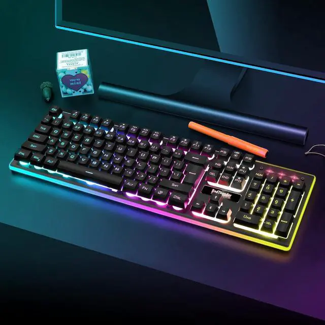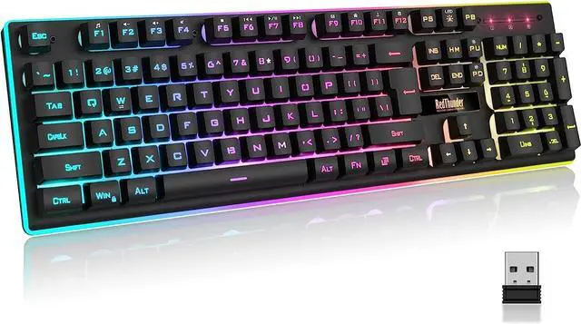 Light Up Keyboard with Long Battery LifeRedThunder K10 wireless version has built-in three groups of rainbow backlight effects, supports 2 breathing modes, 3 static modes, and 4 brightness levels. The luminous design of Letters, logo, gaps and surroundings makes it the best light up wireless keyboard on the market(Note: There is no surrounding light in the right top corner due to the indicator light). 3000 mAh battery allows you to use it continuously for 8 hours with light.