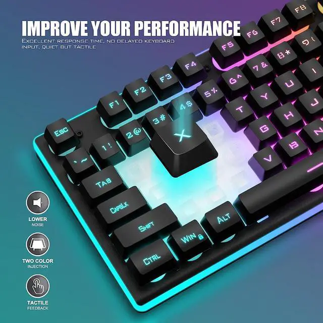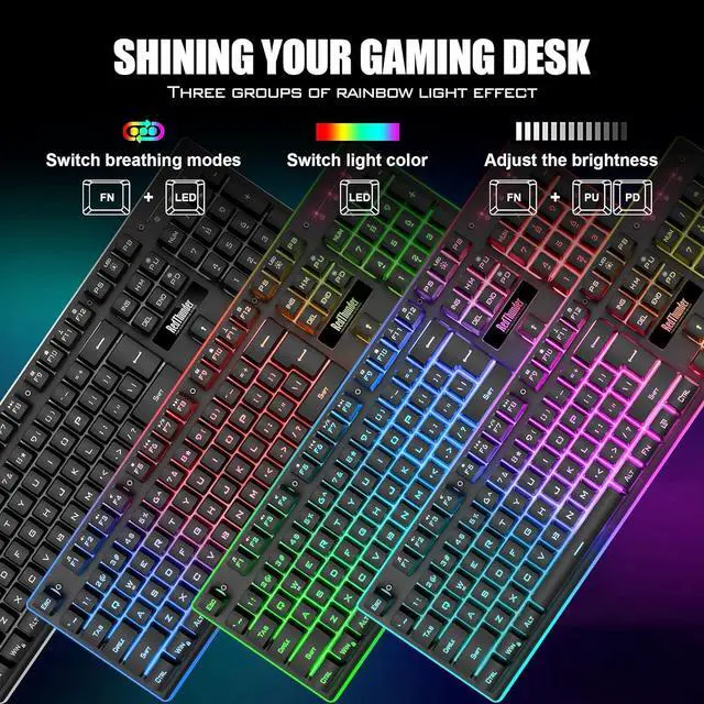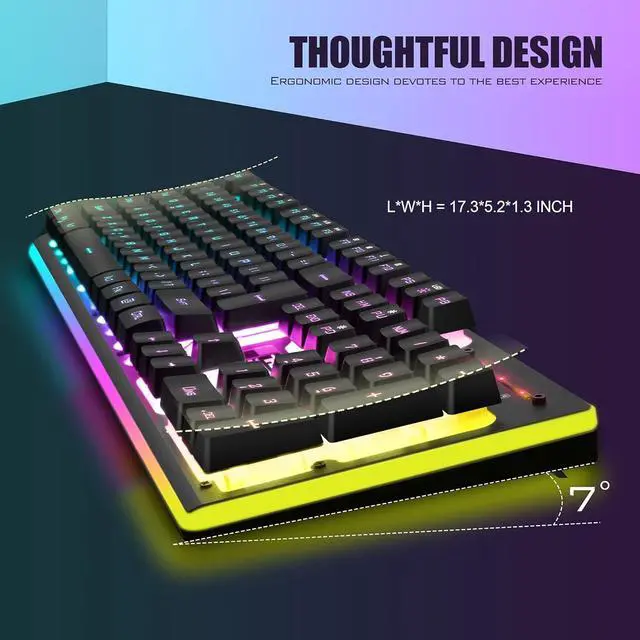 Mechanical Feeling Gaming KeyboardCompared with a noisy mechanical keyboard, each keystroke produces a soft sound, providing a very pleasant typing experience. Compared with ordinary wireless typing keyboards, every keystroke has clear feedback and a slight click sound, coupled with the floating ergonomic layout of the keycaps, it can bring you a more enjoyable gaming experience.