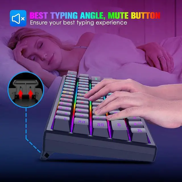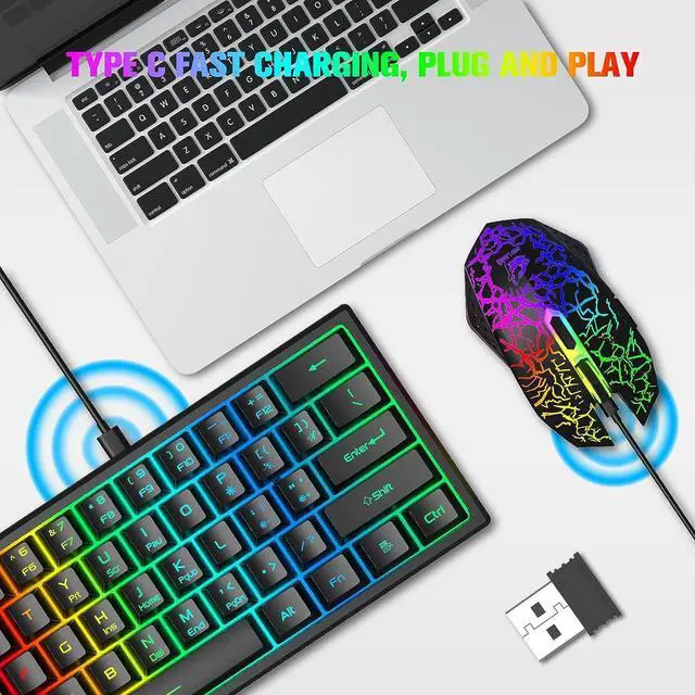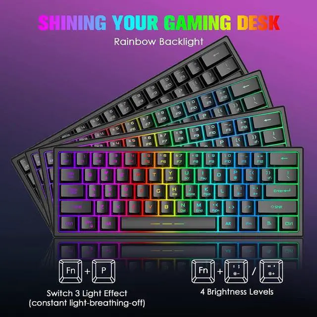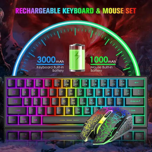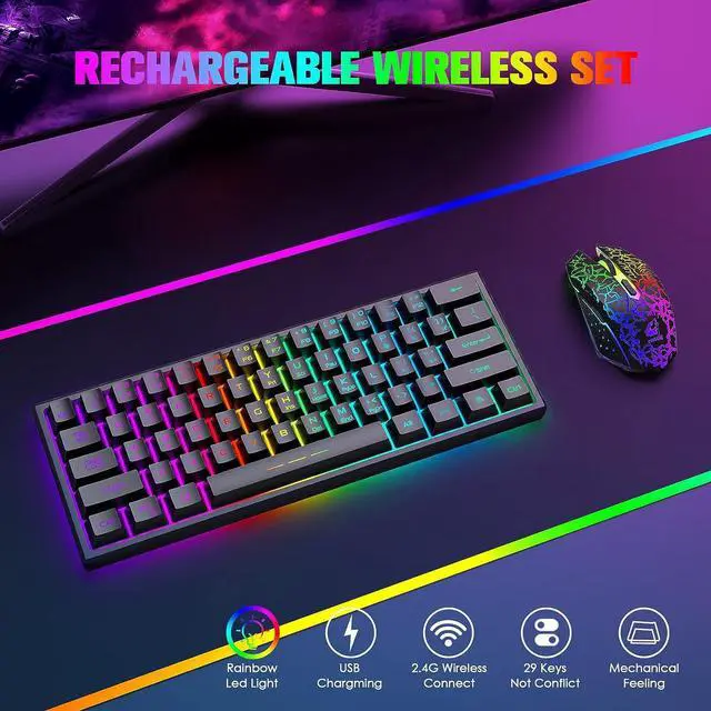 Compact 60% LayoutThis wireless gaming keyboard is designed with minimalistic 61 key layout, mini size, utilize your desk room to the maximum extent, give more space for mouse movement, lightweight, wireless, and rechargeable feature make it portable, glowing character, removable keycaps, easy to clean and replace, no worry about wear out, FN key combination function make it easy to access to more keys function like a full size keyboard, very practical.