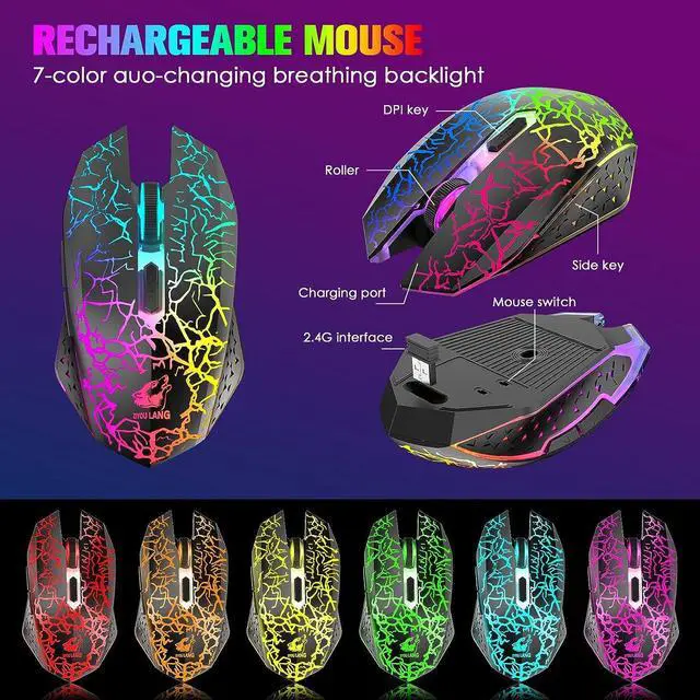 Wireless Backlit MouseThis gaming mouse uses a cool crack design, with 7-color breathing rainbow backlight and 3 levels of adjustable DPI (800-1600-2400), creating a beautiful visual experience, more flexible and accurate to use. The muted mouse button design can reduce noise. Precise e-sports engine, professional e-sports game chip, stable transmission, accurate analysis, make you better in games or work.