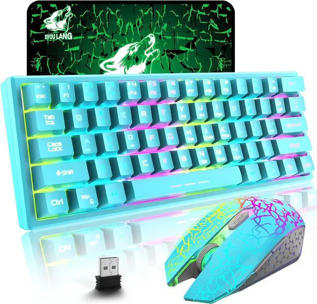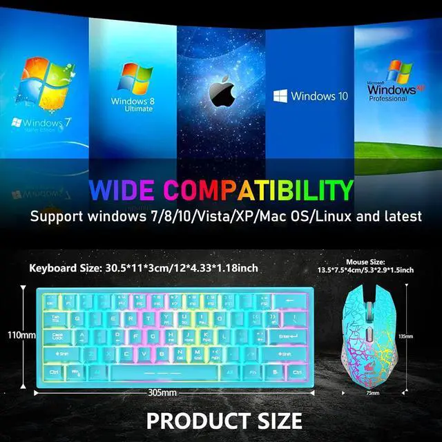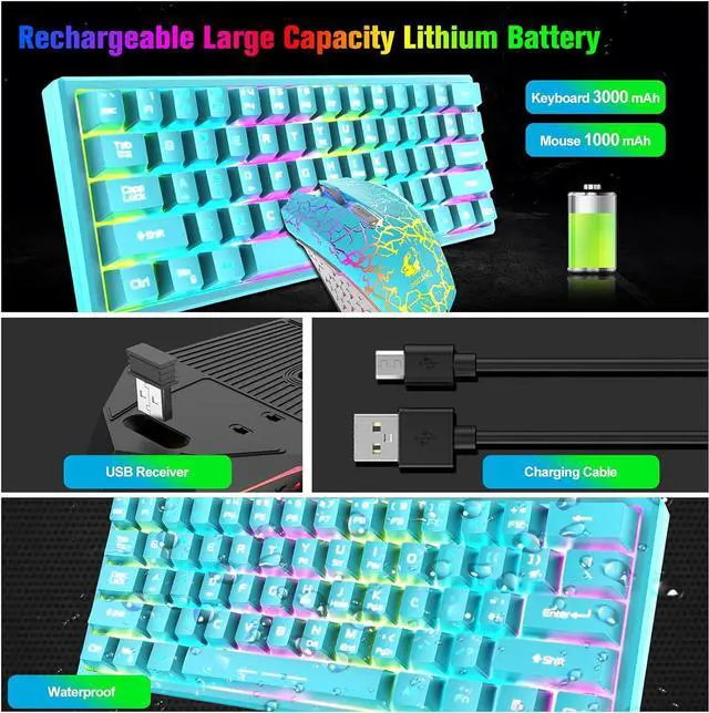 Compact 60% LayoutThis wireless gaming keyboard is designed with minimalistic 61 key layout, mini size, utilize your desk room to the maximum extent, give more space for mouse movement, lightweight, wireless, and rechargeable feature make it portable, glowing character, removable keycaps, easy to clean and replace, no worry about wear out, FN key combination function make it easy to access to more keys function like a full size keyboard, very practical.
