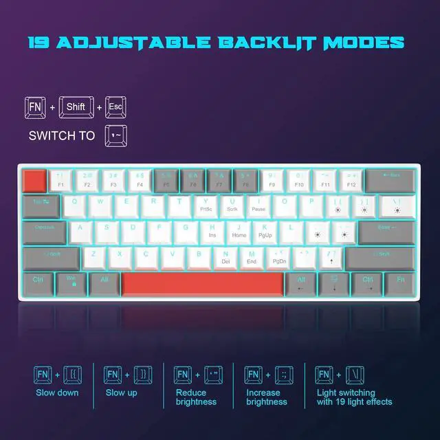 Solid Sea Blue Color Backlit And 19 Mode BacklightMageGee 61 keys mechanical gaming keyboard key light has 19 backlight operation modes (Fn2+| (Light Switching); The light can also be turned off if you dont need lighting. The double-shot injection molded keycaps provide elegant and clear uniform backlighting without glare.