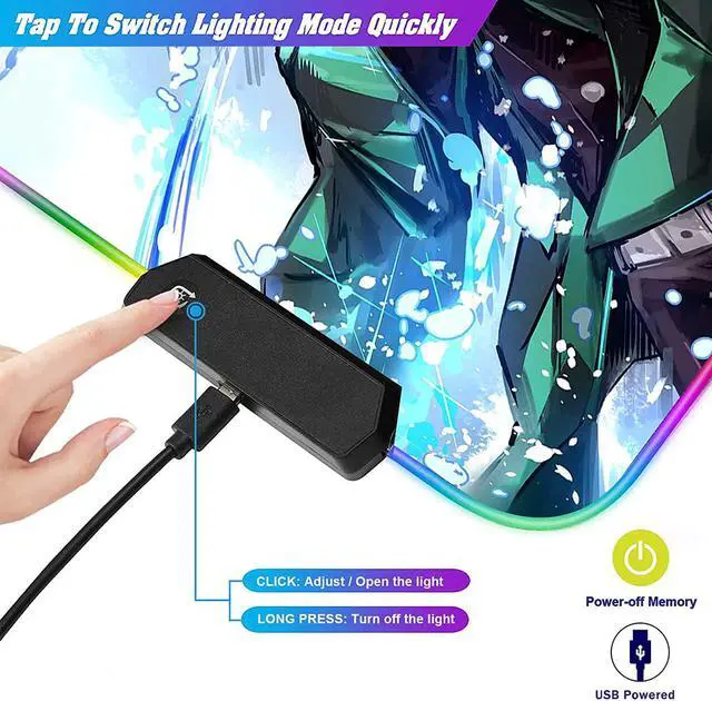 • ???12 LIGHTING MODES?The RGB Gaming Mouse Pad Is Powered By A USB Cable And The Edge Is Designed With Super Glowing Fiber. 12 Lighting Modes : Green,Blue,Purple,Red,Light Blue,Yellow, White,Magenta,Orange,Magic Flash,Magic Slow,Rainbow Breathing.You Can Choose The Mode You Like.