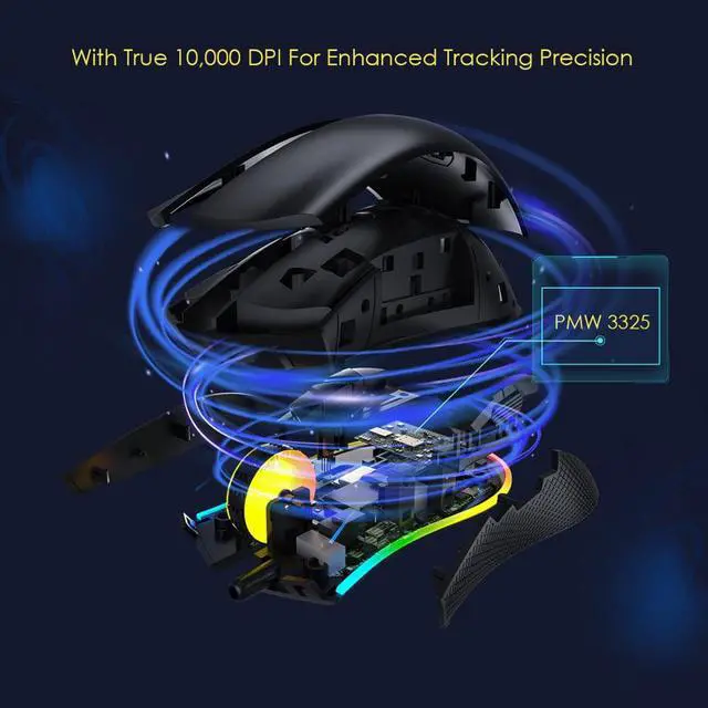 The gaming mouse with PMW3325 professional sensor. Compare to 3310, 3050, 3090, 3305 sensors, PMW3325 captures more accurate and faster movement with 5000 FPS, 1000 Hz polling rate, 50G acceleration and up to 100 inches per second (IPS) with 99.2% resolution accuracy.