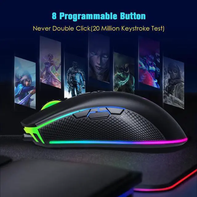 With 5 default DPI levels available from 1200 to 10000 DPI, the gaming mouse easily adjust speed instantly to match different gaming scenery. 4 polling rates (125Hz/250Hz/500Hz/1000Hz) ensures smooth and high-speed movement.
