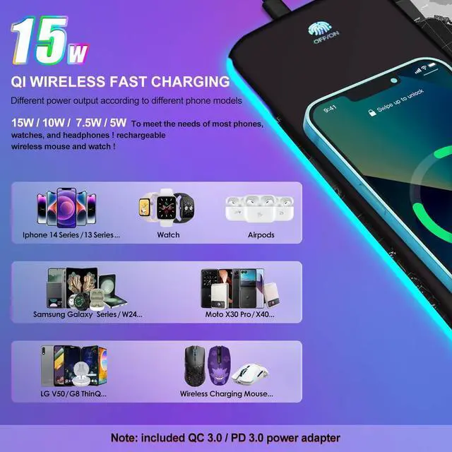 15W QI Wireless Charging Mouse pad + 30W PD charger The Large Mouse pad Built-in 15W wireless fast charging, which comes with a 30W PD charger and a 6.5 ft PD 5A fast charging cable. This wireless charging mouse pad supports all QI wireless charging devices. such as Compatible with iPhone 8/X/XR/XS/11/11 Pro/12/12 Pro/12 pro max/13/13 Pro/13 pro max, iPhone 14 / 14 Pro, Compatible with Galaxy 10/S9/S8 Plus, Galaxy Note 9/8, Galaxy Buds and so on