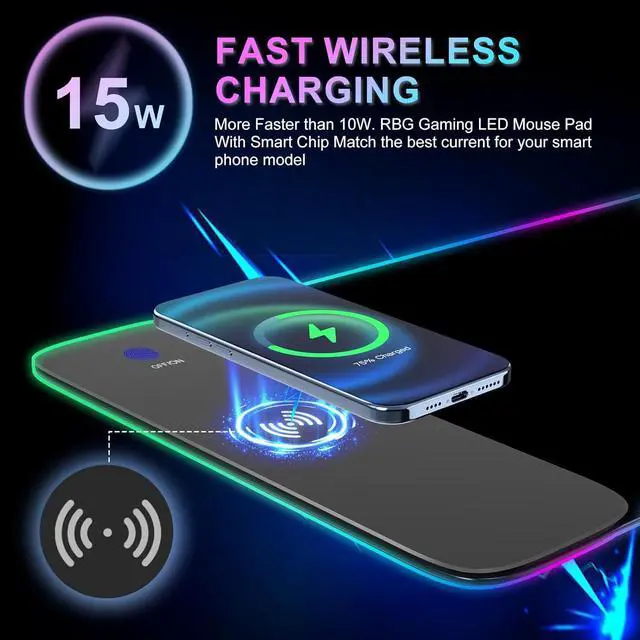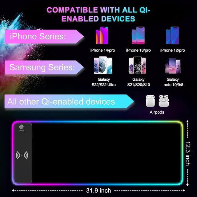 15W QI Wireless Charging Mouse padThe 15W wireless charging keyboard mat have a fastly charging. Supports all QI wireless charging devices. such as iPhone 8/X/XR/XS/11/11 Pro/12/12 Pro/12 pro max/13/13 Pro/13 pro max, iPhone 14 / 14 Pro, Samsung Galaxy 10/S9/S8 Plus, Galaxy Note 9/8, Galaxy Buds and so on