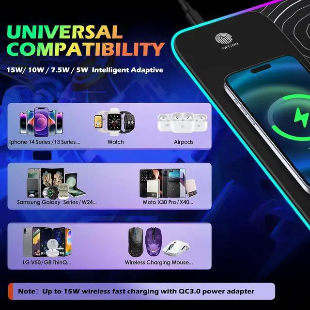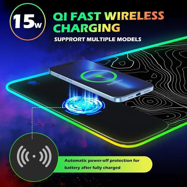 Wide Compatibility: The keyboard mouse pad gaming rgb Compatible with all devices that support wireless charging, including popular brands like Apple, Samsung, and more. Such as iPhone 14/iPhone 14 Pro/Phone 14 Plus/Airpods. After being fully charged, it will automatically stop charging to ensure safety