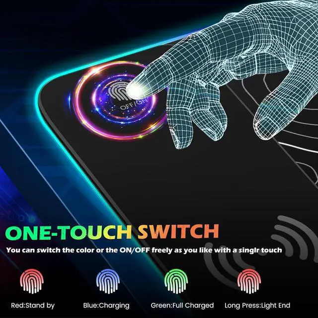 Easy to Use: Simply place your phone on the desk matt for desktop of the charging area to start charging. 3 charging modes indicator - Blue for charging, Green for full charged, and Red for standby mode. One button is designed to switch the light colors on/off. Choose your favorite color mode and enjoy your gaming experience