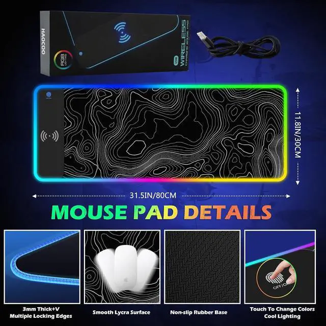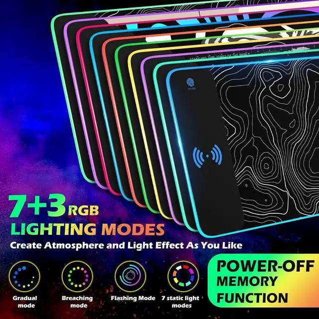 10 Led RGB Lighting up Modes: Large desk mat with wireless charger has 10 lighting modes, including 7 static light modes and 3 dynamic modes. Offers a cool atmosphere when playing games or working. The memory function saves your last mode