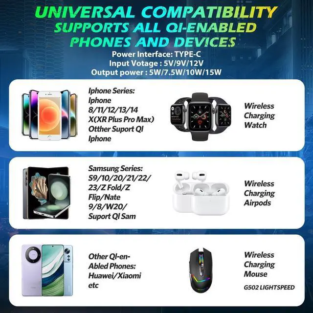 15W RGB Gaming Qi Wireless Charging Mouse PadRGB Gaming mouse pad built-in 5/ 7.5 /10/15W wireless fast charging compatible with smartphones which support wireless charging such as iPhone 8/X/XR/XS/11/11 Pro, Samsung Galaxy 10/S9/S8 Plus, Galaxy Note 9/8, and all other devices that support Qi. (Please note that the charging adapter is not included in this package. You can find a bundle with a charging adapter in our Amazon store. )
