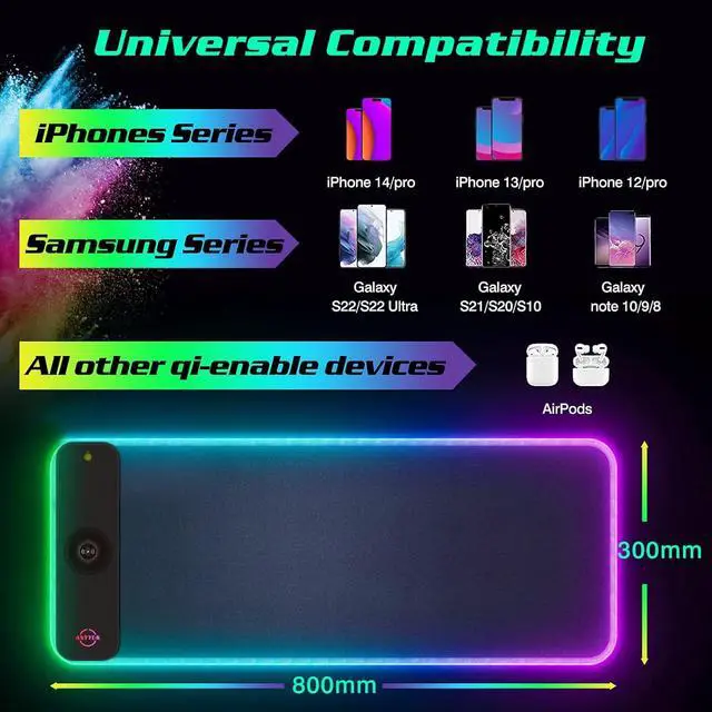 Built-in 15W wireless fast charging compatible with smartphones which support wireless charging such as iPhone 8/X/XR/XS/11/11 Pro, Samsung Galaxy 10/S9/S8 Plus, Galaxy Note 9/8, and all other Qi-enabled devices. 3 charging modes indicator - RED for charging, GREEN for full charged, BLUE for standby mode. (NOTE: 10W need power adapter 9V 2A, But power adapter is not included with this Mouse Pad)
