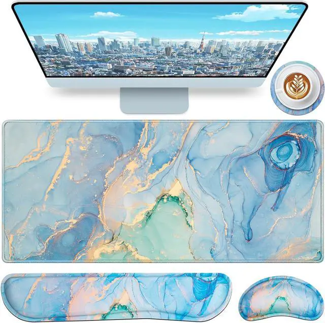 Wrist Support Set: Large Gaming Mouse Pad( 35.4 × 15.75 in), Keyboard Wrist Pad( 17.4 inches× 3.15 ×1in), Mouse Wrist Pad( 5.5 × 3.1 ×1in), Coaster( 3.9 × 3.9 in)Extended mouse pad provides additional space to accommodate mouse, mechanical keyboard, laptop and other office supplies to keep your desk clean and tidy.