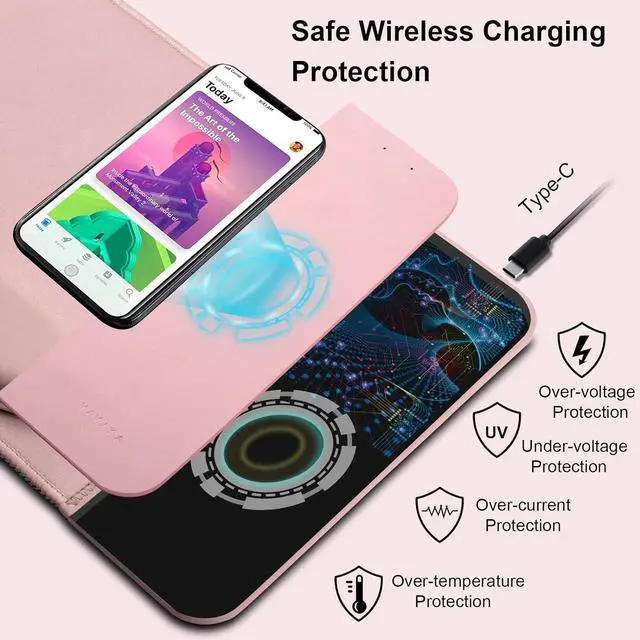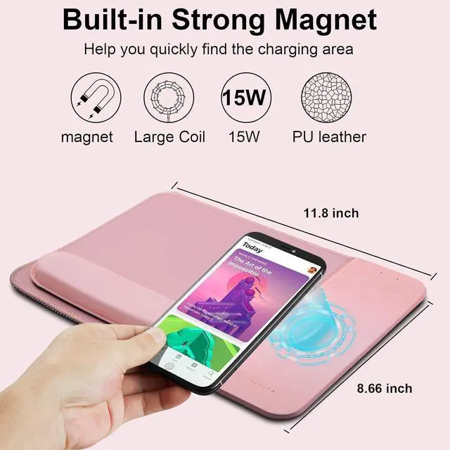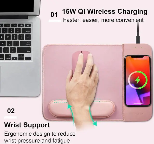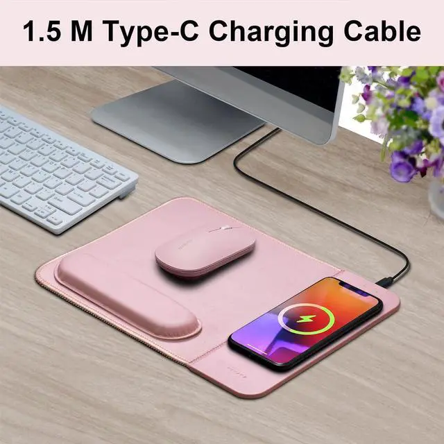 VIVIYA 15W Wireless Charging Mouse Pad with Detachable Wrist Support, Fast QI Phone Charger Mouse Mat for iPhone 14/13/12/11/X/8 and Samsung Multiple Mobile Devices (Pink)