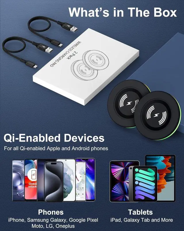 Package Content of Wireless Charger Kits2* 3Feet Braided USB-A to USB-C cords-Black and 2* 15W Wireless Charging Pad-Black. [NOTE: The power adapter is not included]