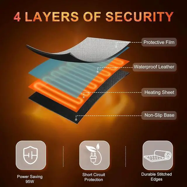Fast Heating: The obvious heat can be felt within 15 second. The heating sheet has been twisted and tow-tested hundreds of times and is durable and uniform. Besides, not worry about excessive electricity consumption. PT heating film, low power consumption (45W)