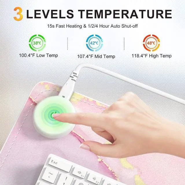Heating Temperature: Touch the middle switch to adjust the level. The warming pad has level 3 temperature, 100.4, 38, 107.6, 42, 114.8,