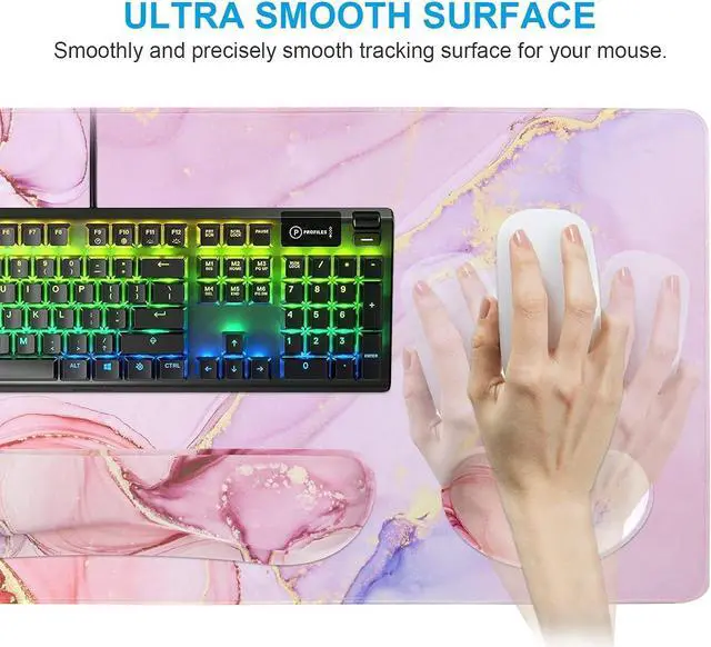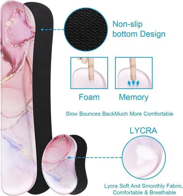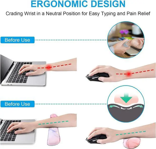 Wrist Rest for Computer Keyboard and Mouse: With Comfortable Memory Foam & Breathable Material to the pads. The keyboard wrist & Wrist pad is made of cushioned neoprene. The fabric of the surface is super soft. waterproof lining can prevent damage from spilled liquid. slow bounces back and are not easy to out of shape provides comfortable and elastic support to the wrist.