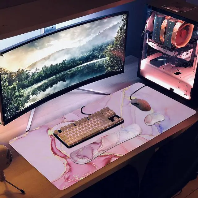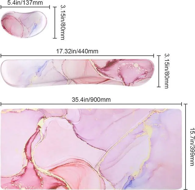 large mouse pad: 35.4 × 15.75 × 0.1 inch, keyboard wrist rest measures 17.32" x 3.15" x 0.98", Mouse wrist rest measures 5.4" x 3.15" x 0.98". Gaming mouse pad which is large enough to fit a full-sized keyboard and mouse, providing plenty of space for professional gaming or office work, Keep a clean, uncluttered desk.