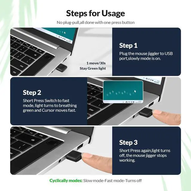 Driver-Free Mouse JigglerComputer mouse mover requires no driver, just plug it into your computer the cursor will start to move automatically. No annoying software installation, easy to use.