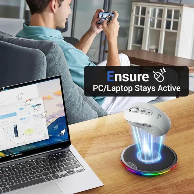 ULTRA-THIN DESIGN: This mouse mover device measures 5.2 * 5.2 * 0.7 inches, making it 50% thinner compared to similar products measuring 6.3 * 6.3 * 1.5 inches. This means you can greatly save desktop space and conveniently carry it with you on the go
