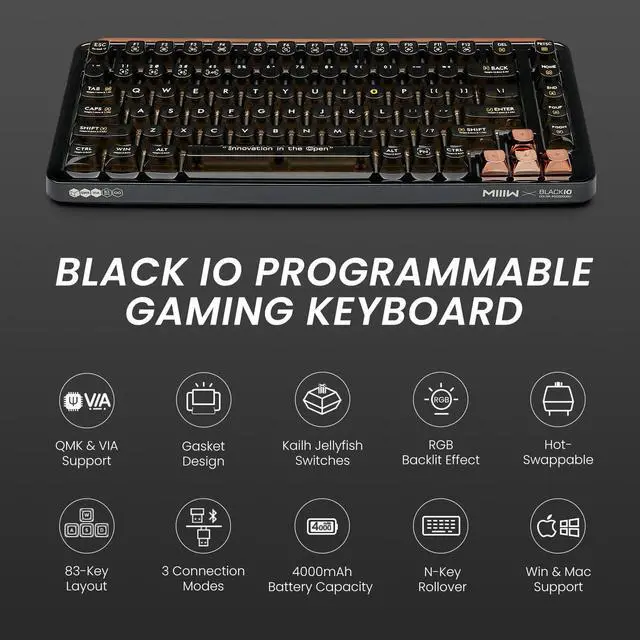 MIIIW BLACK IO uses black transparent keycaps to cover the fully transparent Kailh Jellyfish switches, giving this compact 83-key mechanical keyboard a sense of mystery and uniqueness. Thanks to the hot-swappable PCB, the keyboard allows you to install or change the switches with no soldering required. It supports three connection modes and is compatible with Windows, Mac, Android, and iOS systems, so you can easily switch from work to play. Customizing your keyboard is fun. Thats why the BLACK IO features a programmable layout via QMK and VIA. Plus, it has an N-key rollover, which means no matter how fast you type, it can keep up with every keystroke and has multiple RGB backlight modes that allow you to set it to a single color or light it up with a rainbow wave.