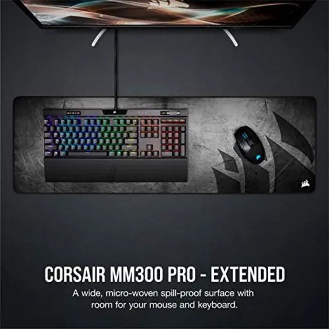 Game in confidence on the CORSAIR MM300 PRO Premium Spill-Proof Cloth Gaming Mouse Pad Extended, providing space for your mouse and keyboard on a roomy 930mm x 300mm surface. A spill-proof, stain-resistant coating protects against accidents, while a micro-woven fabric creates a dense surface for ultra-fast, smooth mouse movements.