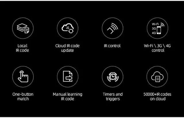 • [APP control] Remotely turn on/off infrared appliances through APP or check the status of appliances in real time anytime and anywhere, making life smarter and more convenient. (RM4C mini only supports 2.4 GHz Wi-Fi)