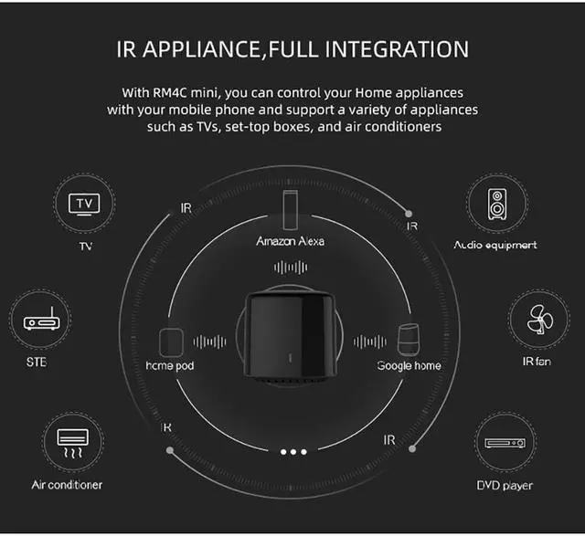 Features: [IR Appliance, Full Integration]With RM4C mini, you can control your home appliances with your mobile phone and support a variety of appliances such as TVs, settop boxes, and air conditioners. [Cloud IR Code database]The cloud red code database covers a large number of home appliance brands the databases is constantly updated and rich, and supports user-defined learning. [IR & RF Universal Remote]Control all IR devices from smartphone and voice automate scences by triggering from sensors. [APP Control]Remote turn on/off IR appliances with App anywhere anytime or check the status of the electrical switches in real time, making life smarter and more convenient. (The RM4C mini only support 2.4 GHz Wi-Fi) [Voice Control]Compatible with for Alexa, for Google Assistant, for IFTTT and for FastCon to voice control your TV, STB, Air Conditioner and Fans. [Timing Function]Set up timers to turn on/off appliances at a specific time or customize scenes with multiple devices. [All in Your Hand]Turn all IR remote controllers into one APP, never get into a mess.