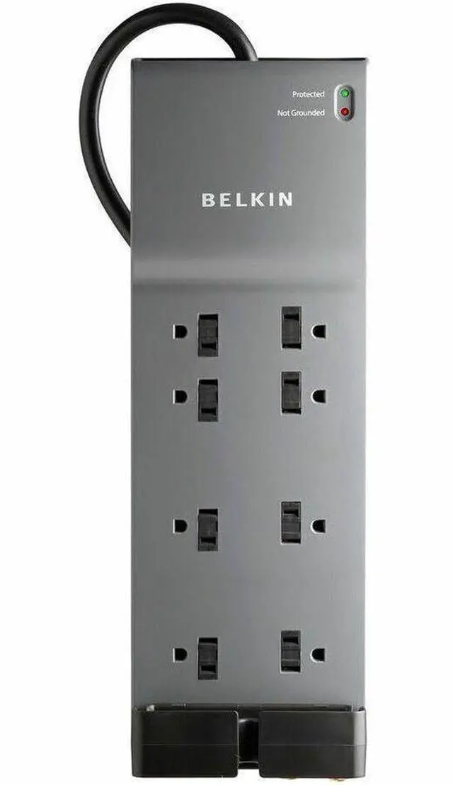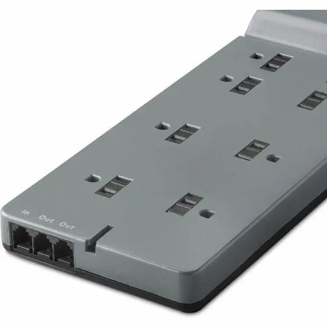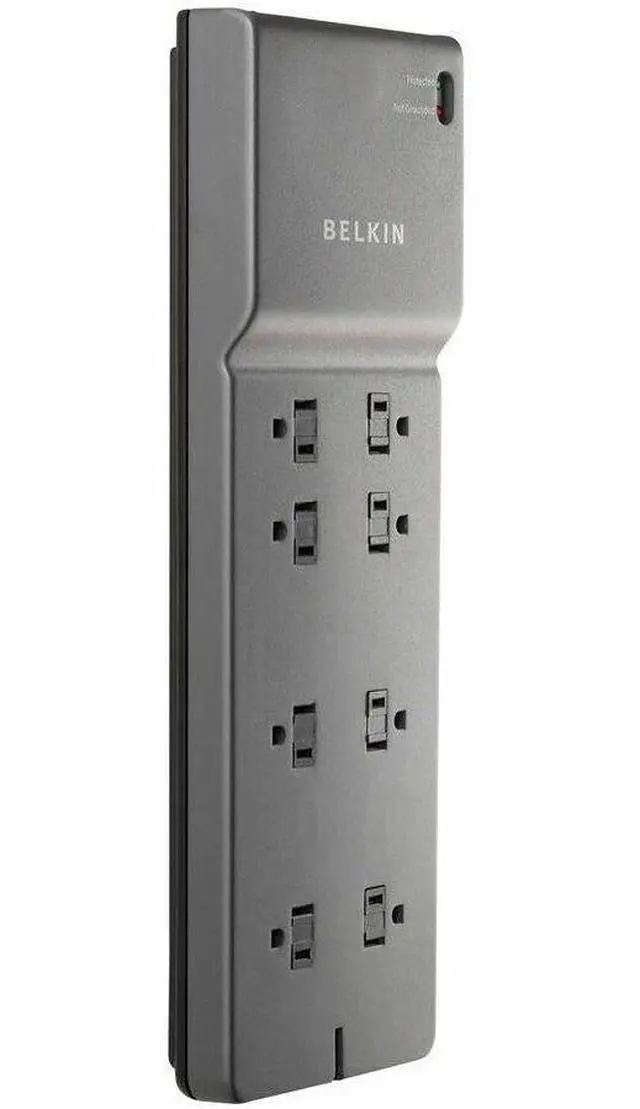 The Belkin 8-Outlet Home/Office Surge Protector protects your electronic devices from surges and spikes. This 3550-Joule surge protector provides eight surge-protected outlets with sliding safety covers to supply complete, 3-line AC protection for your workstations, printers, broadband modems, home theater systems, and everyday household electronics. The surge protector features a slender, sleek design with a right angle plug and a detachable cord-management clip to help keep cables organized.
