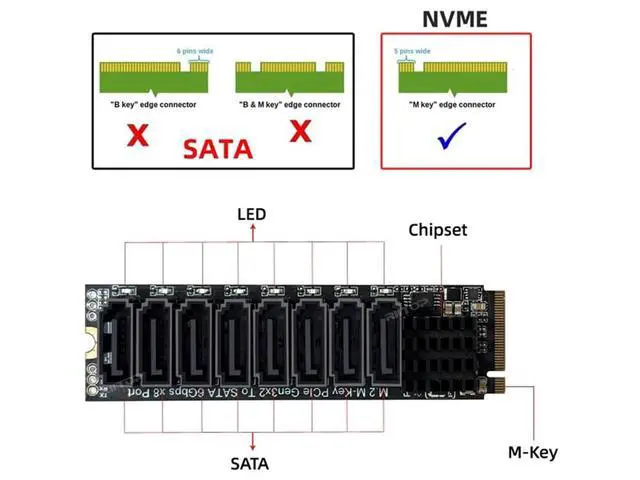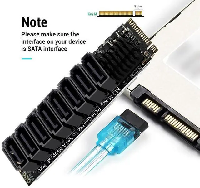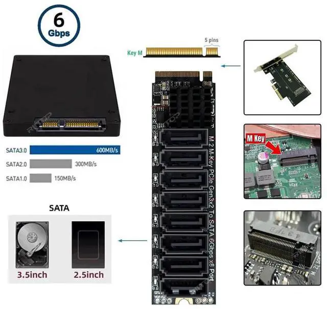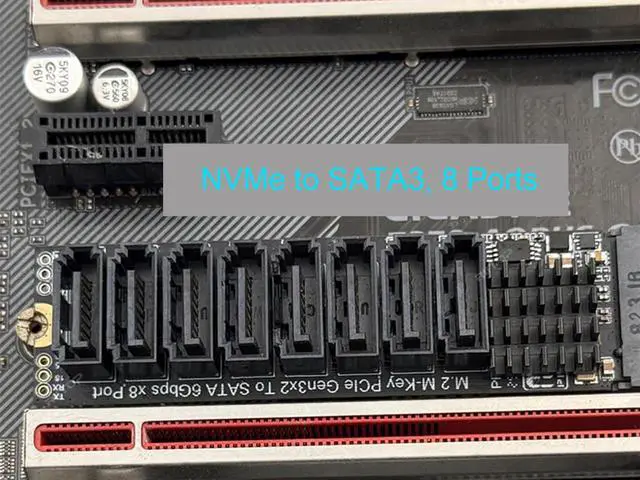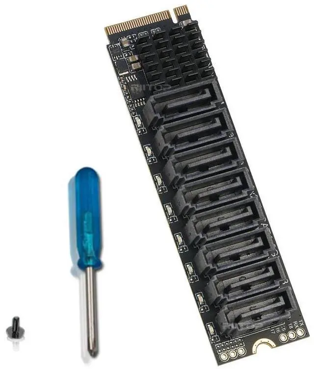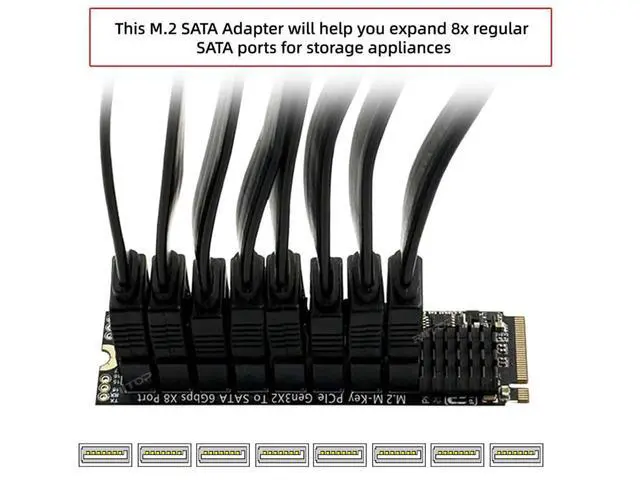 NVMe M-Key to 8x SATA Adapter is designed for less SATA Ports but more spare M.2 NVMe Slots on Motherboard, This M.2 SATA Adapter will help you expand 8x regular SATA ports for storage appliances that use many SSDs and/or 3.5" hard drives.