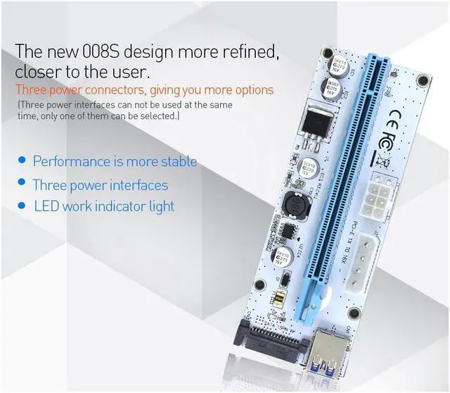 5. Perfect to set up Ethereum mining rigs 6. 4 Holes on the riser card to fasten. 7. LED indicator and fuse are used on the board.