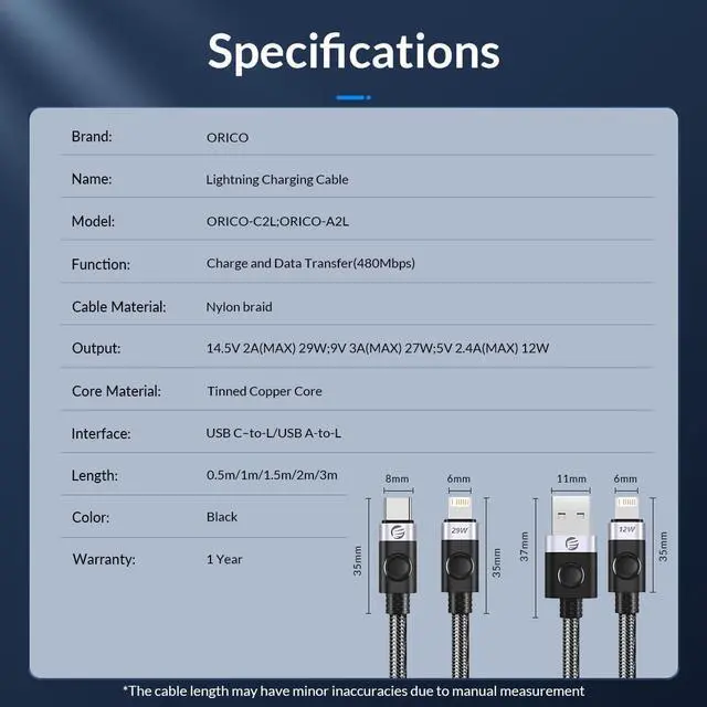 Product: Lightning Charging Cable Function: Charge and Data Transfer (480Mbps) Cable Material: Nylon Braid Interface: USB C to L Length: 0.5 m/1m/ 1.5 m/2m/3m