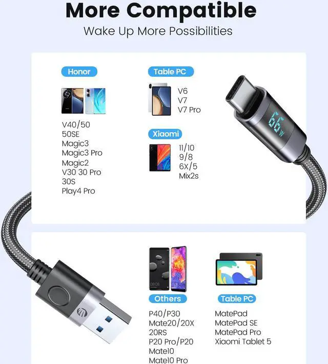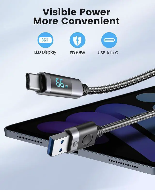 Product: LED Display USB C Charging Cable Function: Charge and Data Transfer (480Mbps) Cable Material: Nylon Braid Interface: USB A to C Length: 0.5 m/1m/ 1.5 m/2m