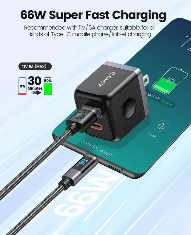 ORICO PD66W USB A to USB C Cable LED Display Fast Charging Charger Wire Cord for Huawei P40 LED Data USB C Phone Cable for Xiaomi Mi 10 Samsung S2 - 5 ft.