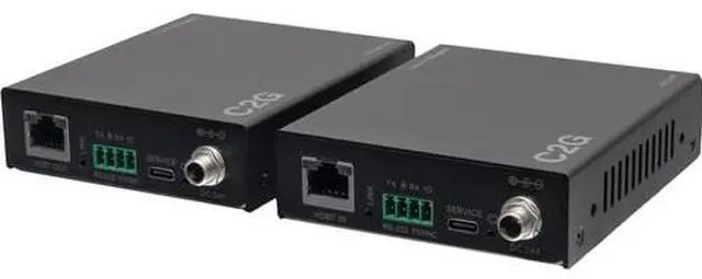 This kit includes the receiver and transmitter. The transmitter sports one USB-B host port, and one RJ45 HDBT port. The receiver sports four USB-A ports where ports 1-2 have a max output power of up to 5V/1.5A while ports 3-4 have a max output power of up to 5V/1A. Both the receiver and transmitter have DC input ports for power and USB-C ports for firmware updates.