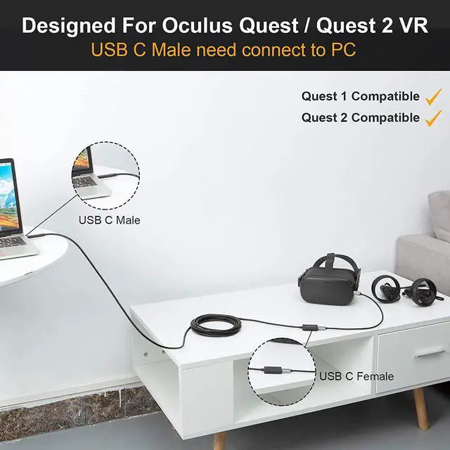 Enjoy PC-VR GamingUSB C Male must connect to the USB 3.1 or Thunderbolt 3 port on your compatible gaming PC, plus the original USB-C cable on Oculus Quest and Oculus Quest 2 VR headset, you can enjoy the VR gaming experience with more than 5 square meters