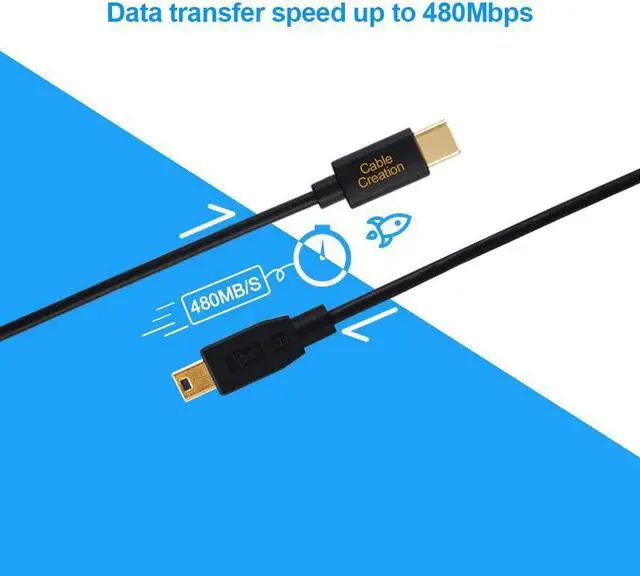 USB C to Mini USB cable connects a computer with a Type-C USB port to legacy USB peripheral device with a Mini B USB port for syncing and charging.