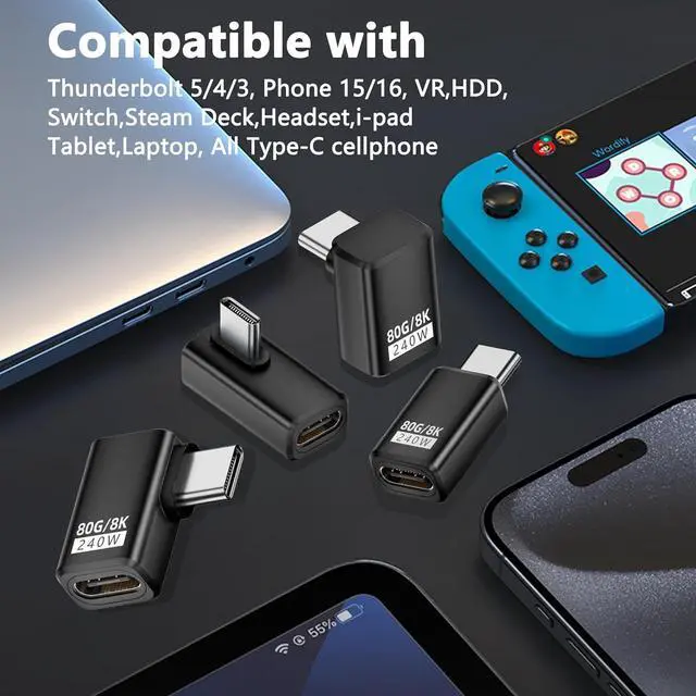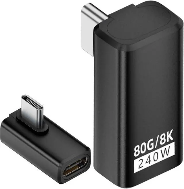 Multi Angle Design: 240w 80gbps usb c adapter offers 4 type: Low ProfileAngled, Right Angle,Up/DownAngle, Straight. 90 degree usb c male to female adapter is convenience to fit snugly without protruding, it protects your devices port and prevents cable wear. Perfect for organizing your workspace and ensuring a clean, clutter-free setup