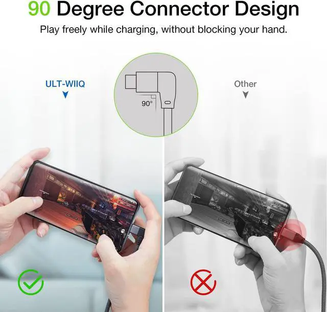 90 Degree Design The special 90° connector design is much more comfortable for playing games or watching videos when you lie on the couch or bed while charging. The net tail is 1.5cm away from the interface. Compared with other 90 degree USB C 3.2 cables, there is no need to consider the protective cover at the charging port being squeezed.