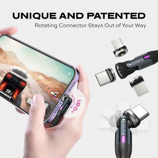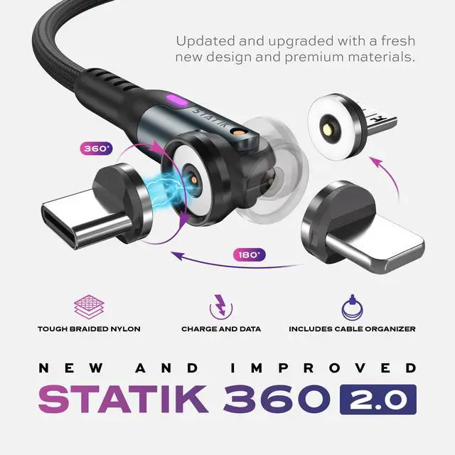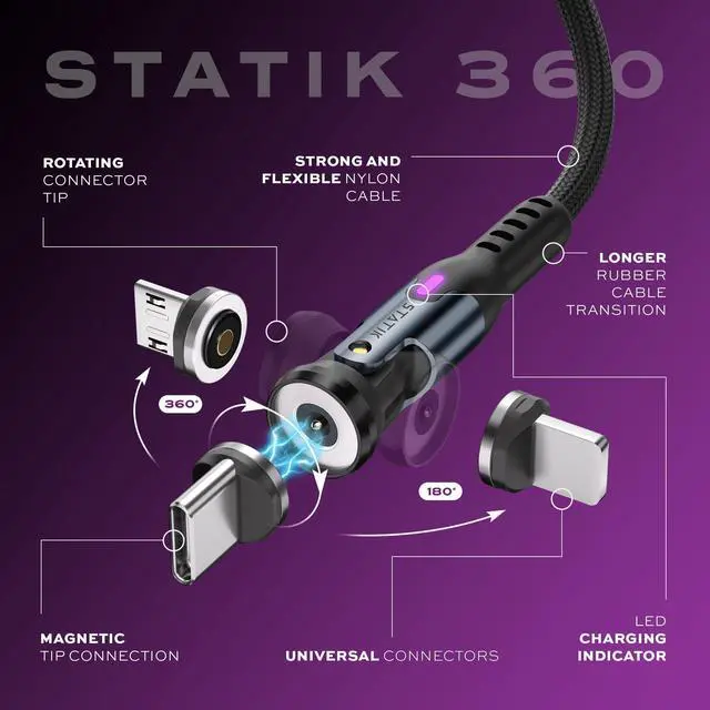 • & : The magnetic USB C cable features removable magnet phone charger heads, allowing you to alternate between USB C cable magnetic cable tips for charging all your devices. Equipped with USB C magnetic, magnetic micro USB, USB magnetic adapter, and magnetic type C charger tips, it's the perfect magnetic charging cable USB C and other devices. , & : The Statik 360 magnetic charging cable is meticulously braided to prevent fraying and potential damage caused by cheap magnetic cables. Included is a robust magnet charging cable organizer, doubling as a USB C magnetic cable tip holder. Custom Liquid Silicone Rubber (LSR) design keeps your magnetic phone charger cable and usb c magnetic charger tips organized while on the move. - : Our magnetic charging cable type C can save you significant repair costs and extend the life of your phone. Unlike a standard magnetic usb charging cable, these magnet chargers are a safeguard. The type C magnetic charger tips rotate 360 degrees, shielding your phone's power port from damage due to dust, accidental pulls, yanks, and trips. : Statik 360 magnetic chargers are designed to