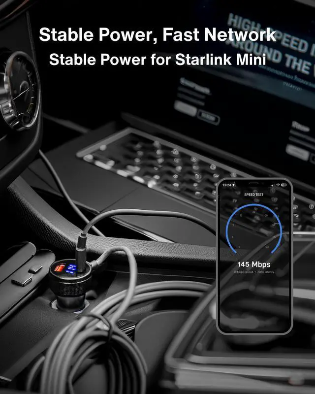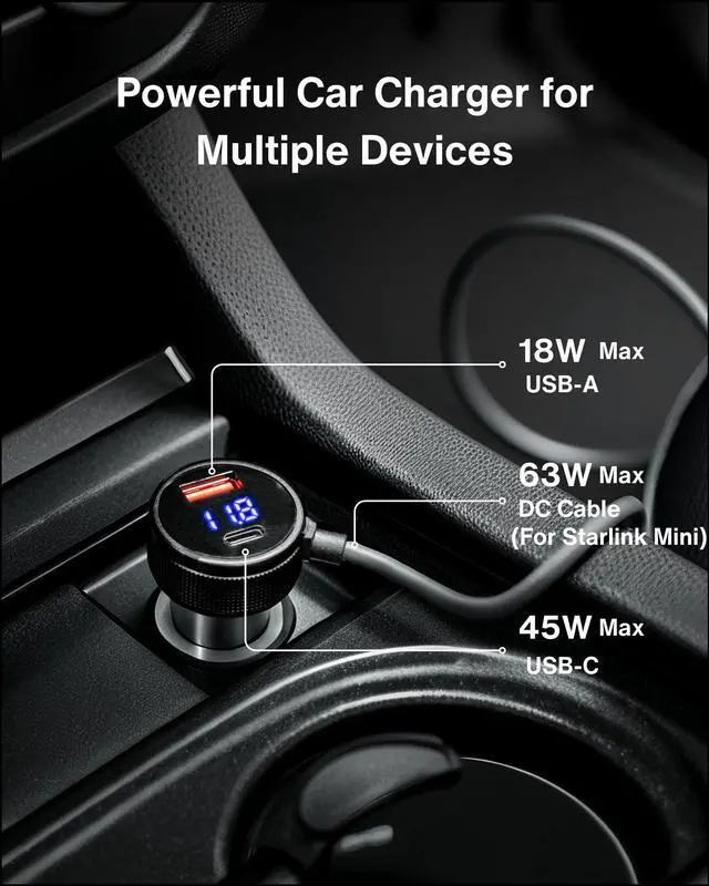 • Dual USB-C & USB-A Ports Fast 33W Charging for Extra Devices: Equipped with USB-C and USB-A ports, this Starlink Mini car adapter supports 33W fast charging, allowing you to charge your smartphone, tablet, or other essential devices while powering your Starlink Mini. No need to carry extra adaptersthis is your all-in-one car charger solution.