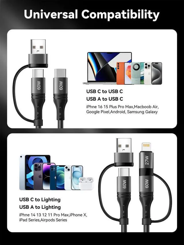 - [What You Get]2Pack 4ft 4-in-1 retractable usb c cable,12 month warranty and 24-hour customer service.If you have any questions about the iphone lightning charger,please feel free to contact us,we will be happy to serve you and give you an easy and pleasant shopping experience.