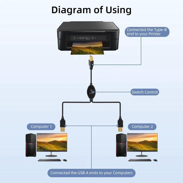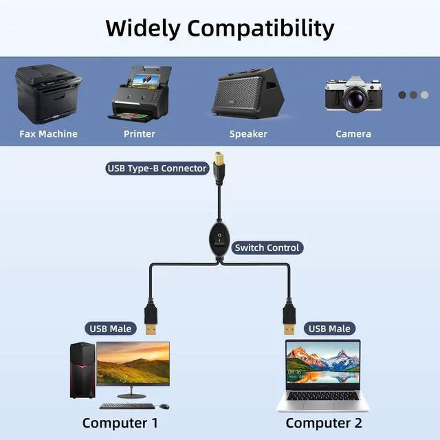 Printer Splitter for Two Computers: This cable converts your USB B plug into 2 USB A male port, connects one USB2.0 peripheral device to two Computers or laptop,allowing easy switching with a flick of a switch. Note: Can not be used at the same time.Very useful product if you have two computers